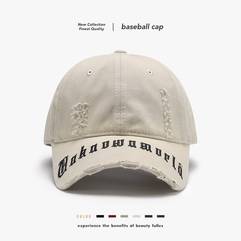 ダメージ加工ベイスボールキャップは、カジュアル感とトレンド感を絶妙に融合させたユニセックスアイテムです。ユーズド感のあるダメージ加工が施されており、見る人に新鮮な印象を与えます。スタイリッシュなデザインは、あなたの個性を引き立てること間違いなしです。