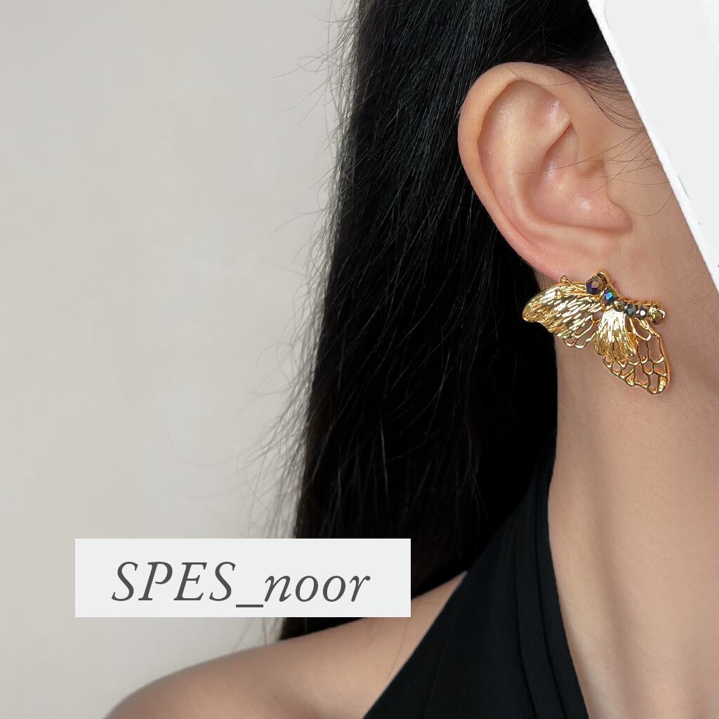 優雅に舞う蝶をモチーフにした、繊細で華やかなゴールドイヤリング。