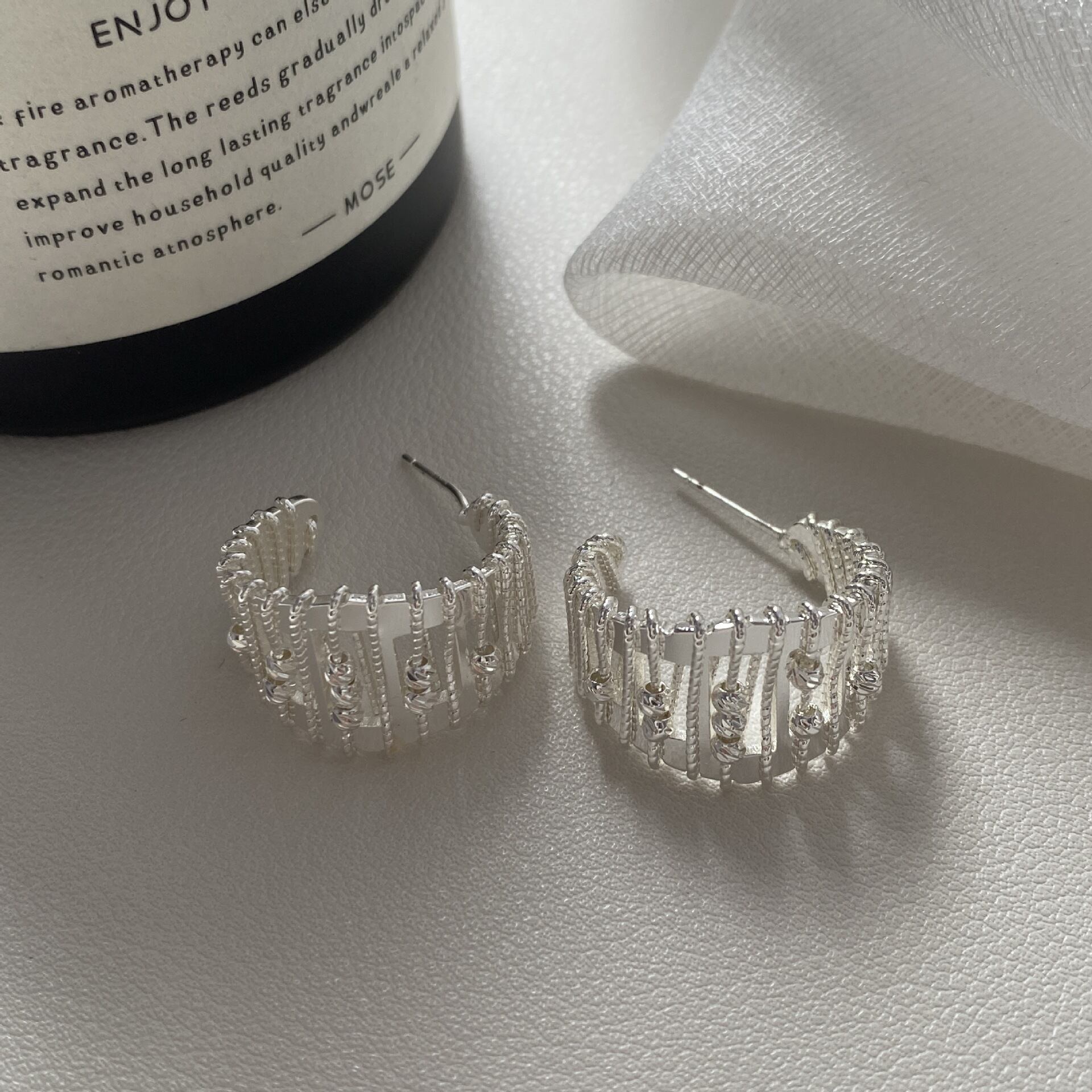 ランダムに重なり合うメタルラインが、光を受けてきらめくフープピアス。
