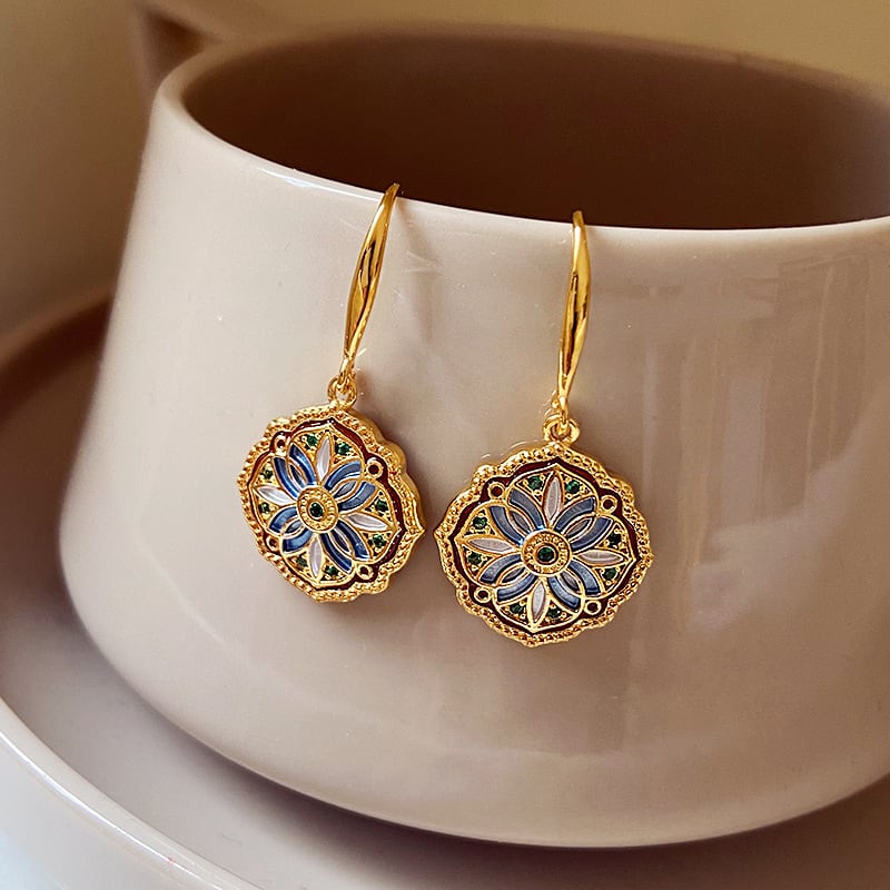 華やかなゴールドに、ブルーとグリーンの花模様が輝くエスニック調ピアス。