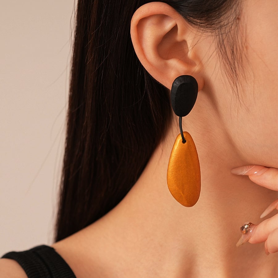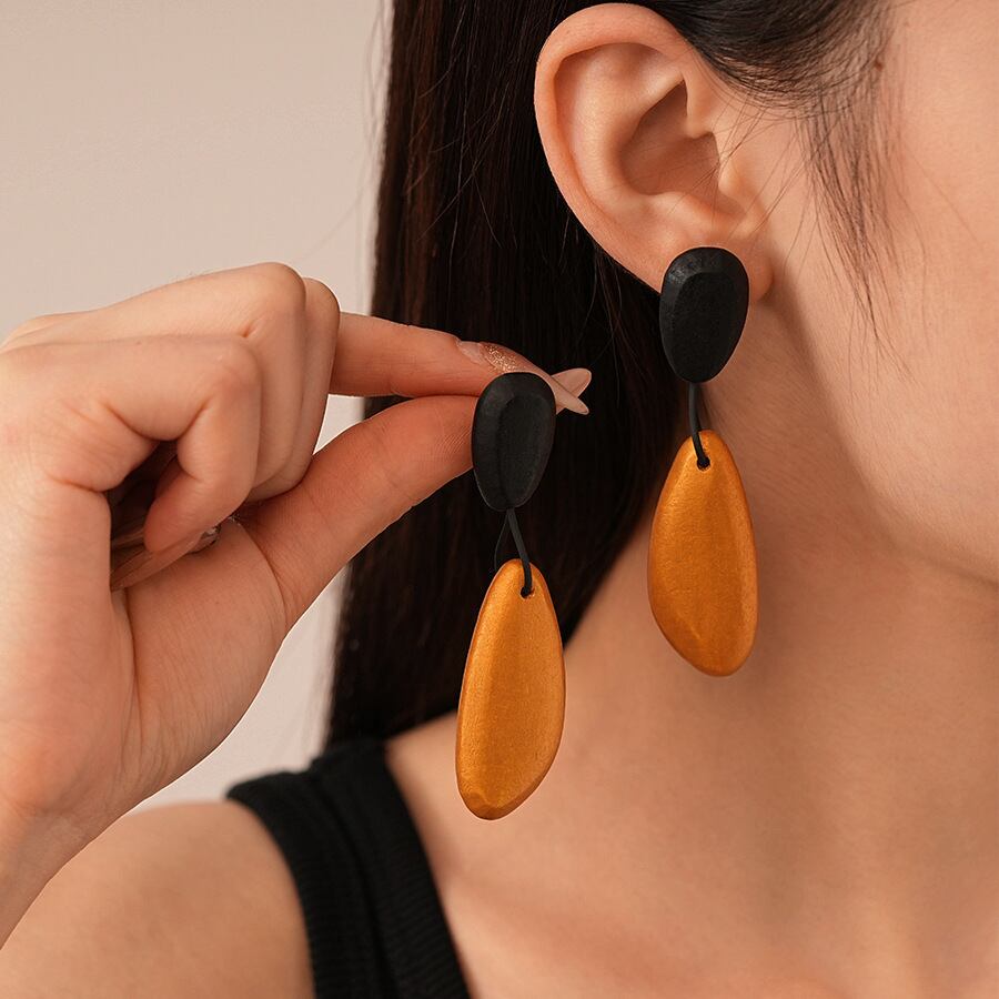 《北欧モード・ウッドアートピアス》 ブラック×ゴールドの大ぶりしずくデザイン