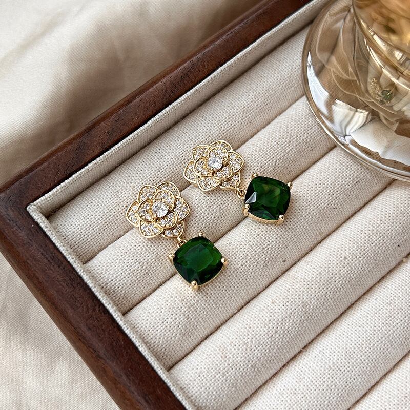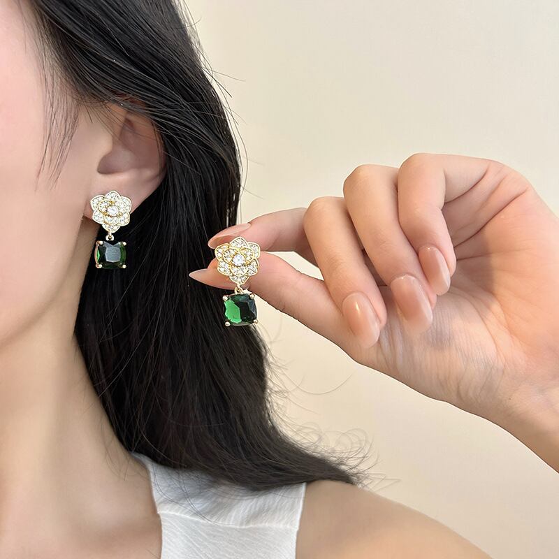 上品に輝くツバキモチーフピアス|ゴールドベース × ラインストーン × グリーンジルコン
