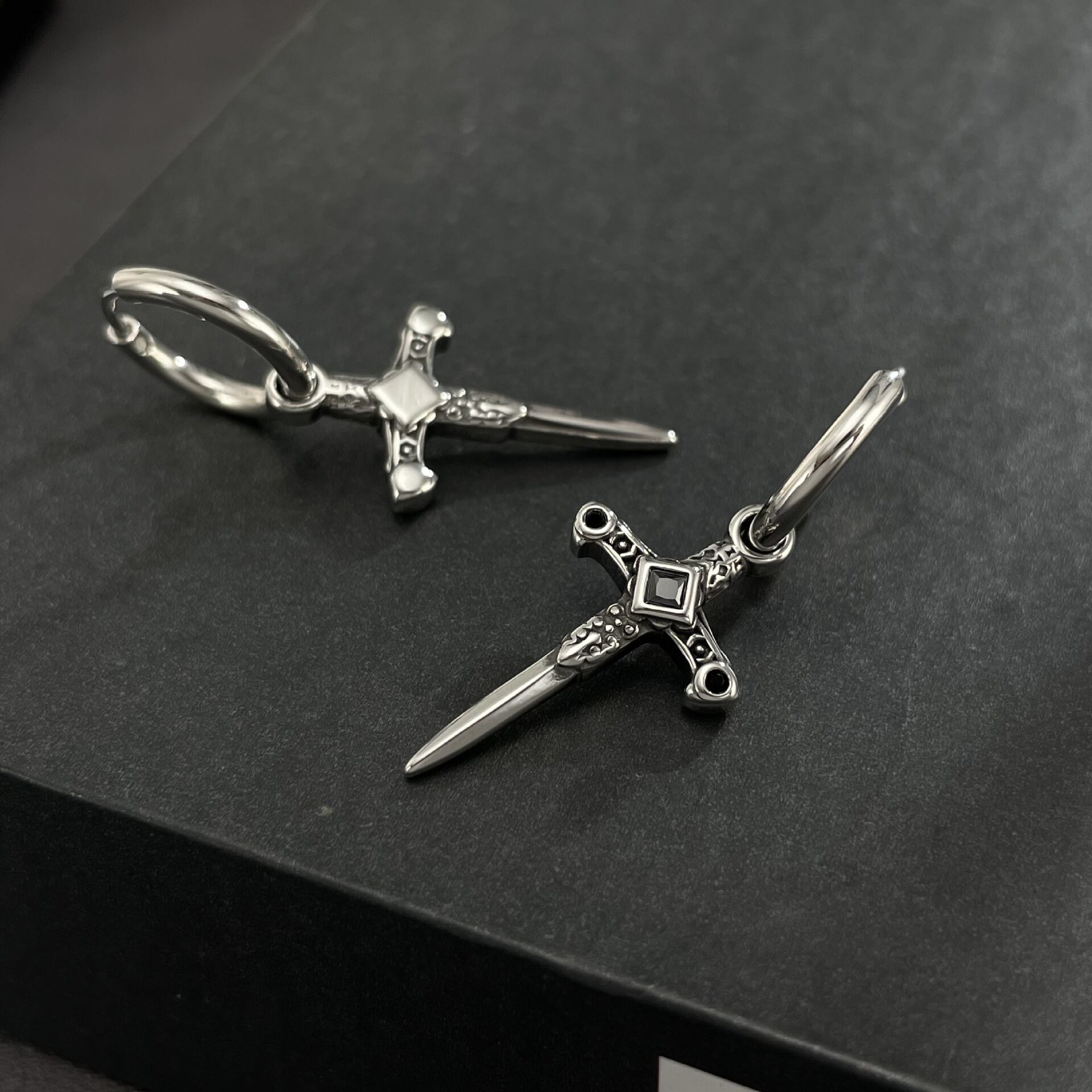 クールで洗練された“ミニ剣(ダガー)”チャームが揺れるフープピアス。ほどよい存在感のある小ぶりサイズだから、普段のカジュアルコーデからモードなスタイル、ユニセックスな着こなしまで幅広くマッチします。