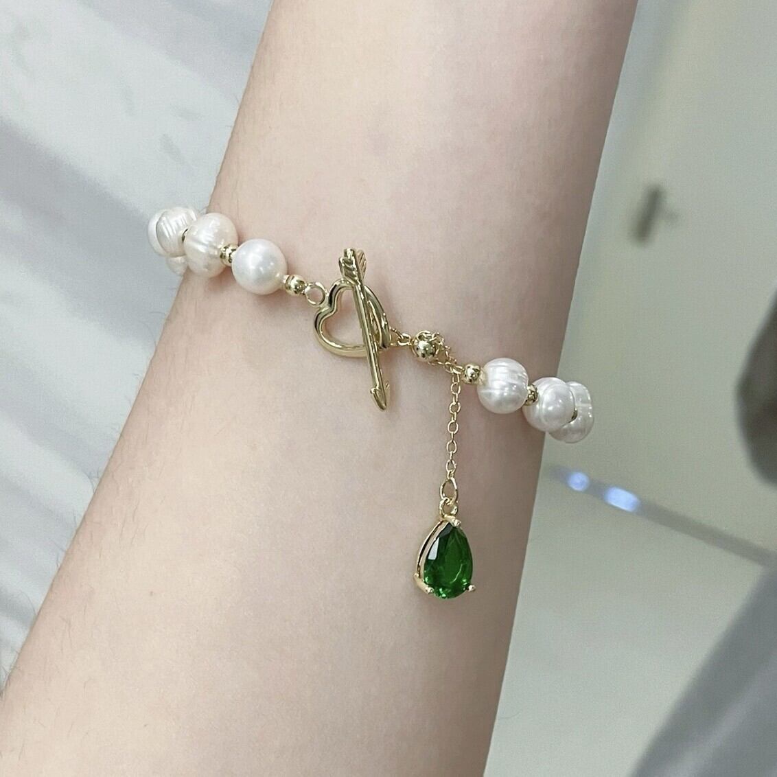 淡水パールとグリーンドロップのハート矢トグルブレスレット