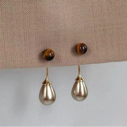 ほんのり温かみのあるブラウンのカボションと、マットなパール風の雫(ティアドロップ)が揺れる上品ピアス。シンプルなワンポイントで顔まわりに柔らかさと深みをプラスします。2025年秋の新作としてリリースした、大人のデイリースタイルにも特別な日にも使えるデザインです。