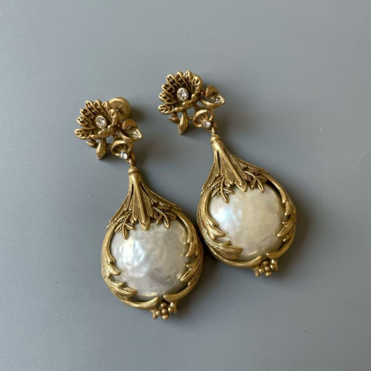 【ヴィンテージフラワー×パール調】アンティーク風 大ぶりドロップピアス|ゴールド|存在感ピアス|結婚式・お呼ばれ・デート