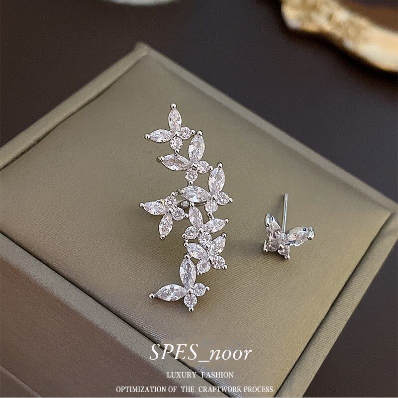 【バタフライリーフ イヤーカフ&ピアスセット】 華奢きらめき・アシンメトリー耳元アクセ/金属製・全長3.1cm