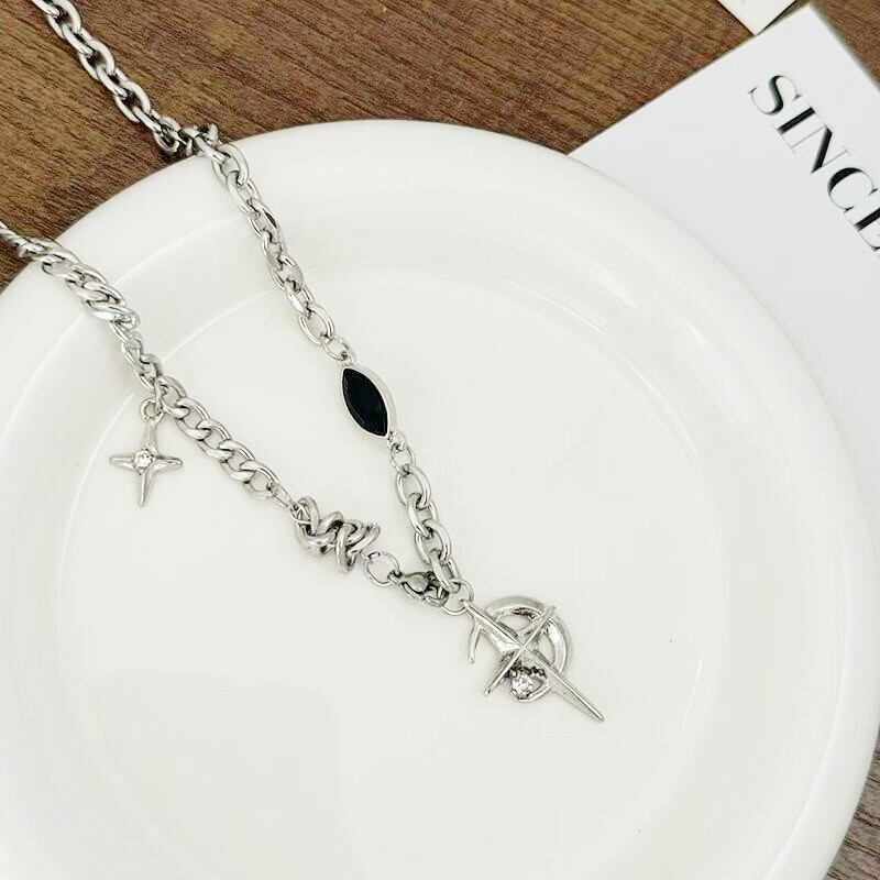 【クロス×オービット】ブラックストーン付き レイヤードチェーンネックレス|シルバー調|ユニセックス