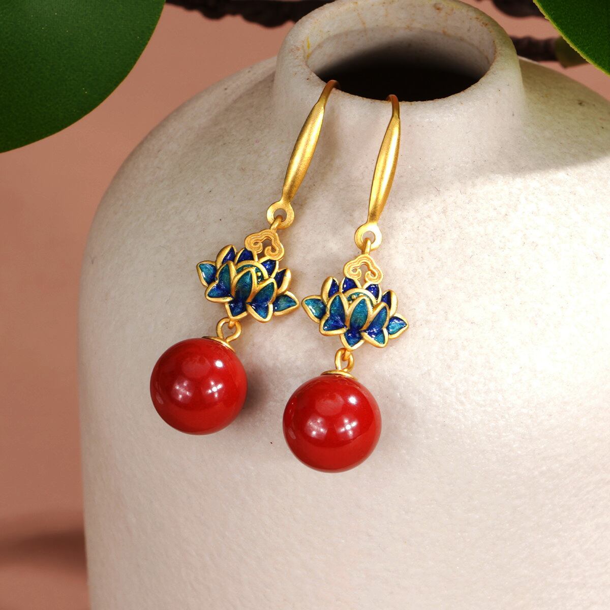 【大人上品×和モダン】蓮モチーフ×レッドストーン 揺れるゴールドピアス|高見え・華やかアクセ